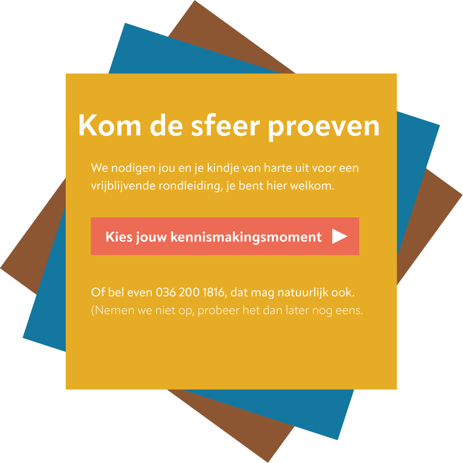 Kies jouw kennismakingsmomentWe snappen dat een basisschool uitzoeken een grote keuze is. Kom daarom eerst bij ons langs om de sfeer te proeven.